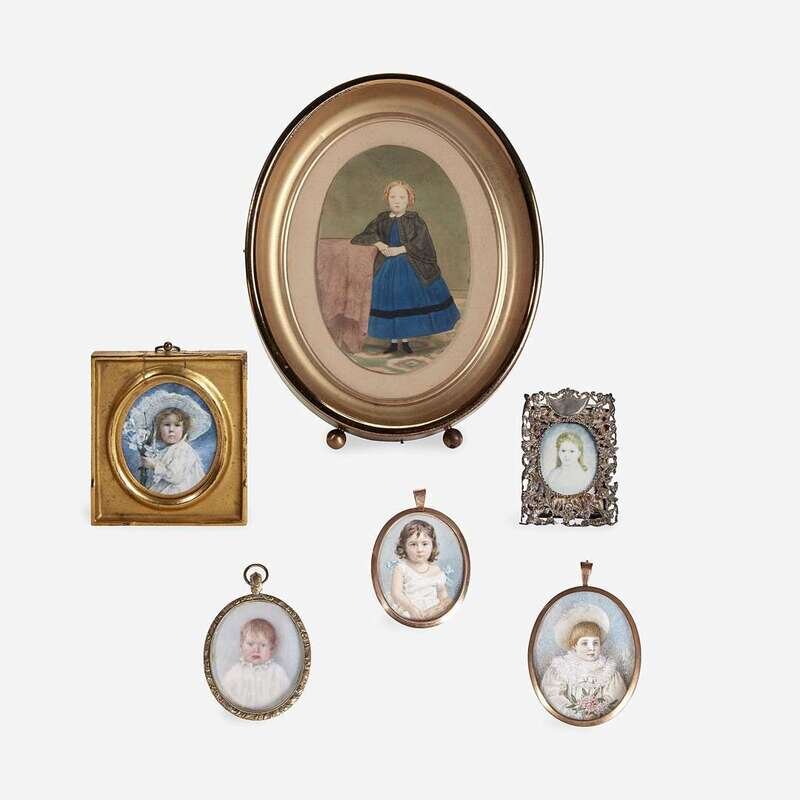 Comprising a color-enhanced photograph of a young girl, Anglo-American, 19th century, framed; a portrait of a young girl in pierced silver frame, early 20th century; a portrait of Vera Pembroke holding lilies, by Miss Lillian D. Darney (1872-1964), circa 1900, with label verso, framed; a portrait of a young girl in white hat and dress holding bouquet, Anglo-American, late 19th century, gilt locket case; a portrait of a young child with blue eyes in white ruffled collar, American School, 19th century, gilt locket case; and a memorial portrait of Katharine Christina Lea, by Emily Drayton Taylor (1860-1952), signed and dated 'E.D. Taylor 1899,' gilt locket case engraved 'Katharine Christina Lea Jan. 29th 1898,' hair fragment with ribbon and gold cipher verso; most watercolor. (6).