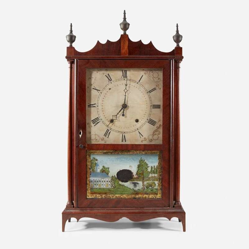 A Federal Carved Mahogany and Églomisé Mantel Clock Eli Terry & Sons, Plymouth, CT, circa 1823-1828