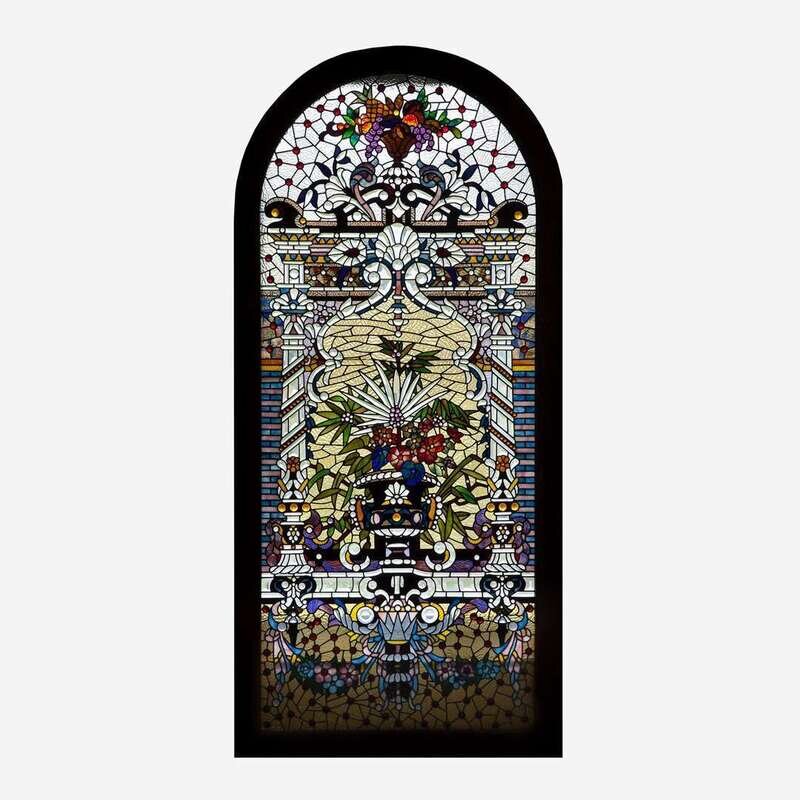 The tall arched rectangular panel composed of numerous shaped and faceted glass inserts forming a central design of an urn issuing exotic flowers, etched signature and numbered 199917, within oak frame.
