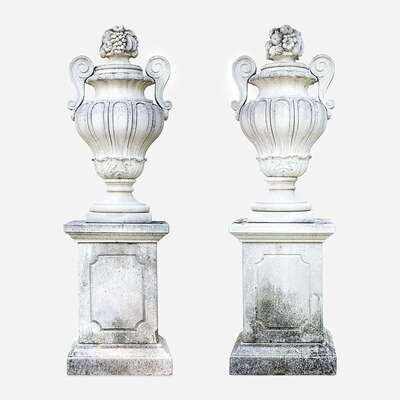 A Pair of Large Composition Stone Garden Urns on Pedestals*