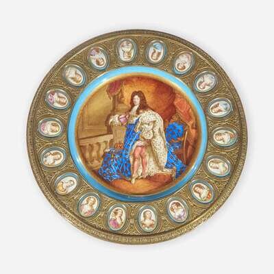 The central porcelain plaque depicting King Louis XIV, signed, l.l., 'D. Petitot,' surrounded by eighteen smaller porcelain plaques depicting mistresses or courtiers; together with a round glass top.