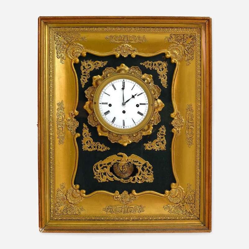 An Unusual French Gilt Bronze, Gilt and Green Painted Wood Wall Clock 19th century