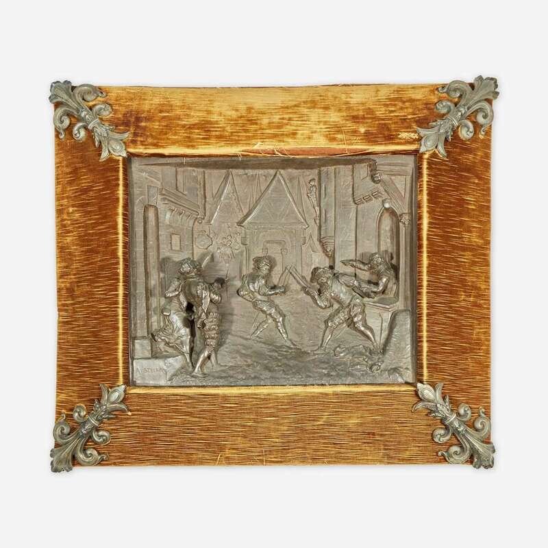 Depicting men in seventeenth-century costume and sword fighting in the street, signed 'A. Stella' lower left, in velvet-covered frame