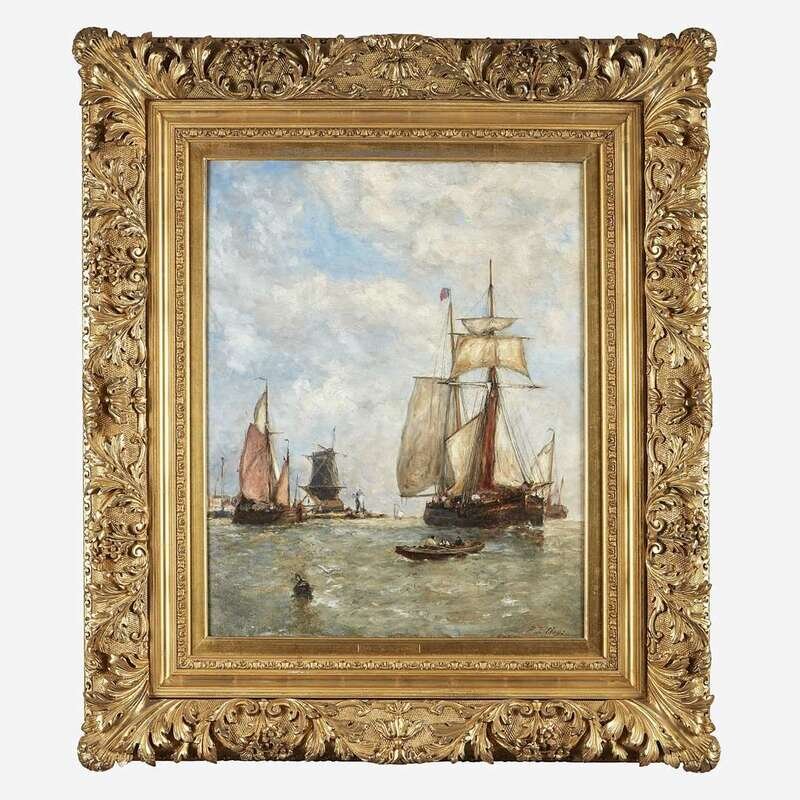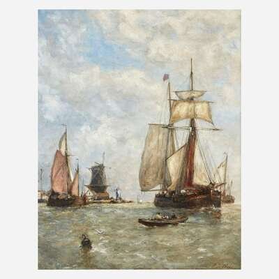 Paul Jean Clays (Belgian, 1819–1900) Barges Moored Before a Windmill