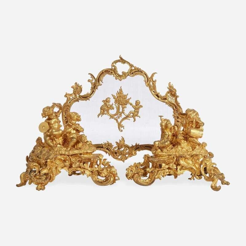Each modelled as a pair of musical putti above a rockwork and rocaille base; together with a conforming firescreen with rocaille cast frame surrounding a mesh guard. (3).