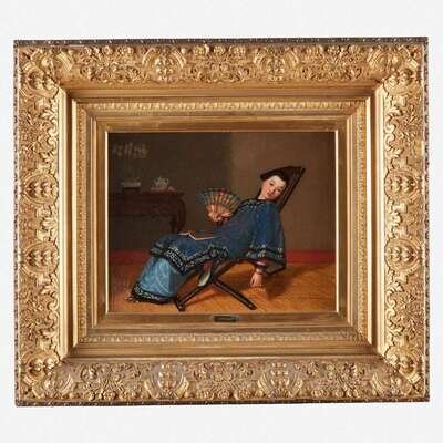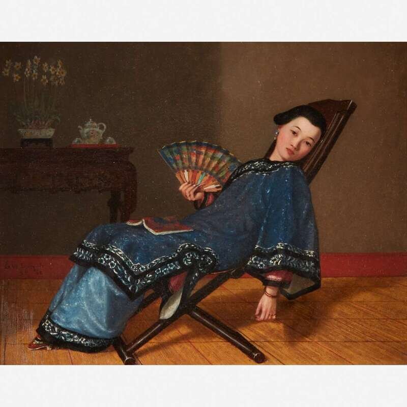 Enoch Wood Perry (American, 1831–1915) Interior Scene with Woman with Fan Laying on Chaise