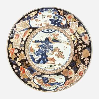 Comprising a pair of Imari chargers, together with a third Imari charger; the pair decorated to their interiors with central roundels depicting boys around a basket of flowers in a garden, the cavettos with lobed reserves depicting pavilion scenes, alternating with roundels all against a gilt foliate ground, the undersides with foliate sprays; the third charger decorated to its interior with lobed reserves depicting birds and flowers at rim, a central roundel depicting an extensive landscape with pavilion scene, the underside with floral sprays. (3).