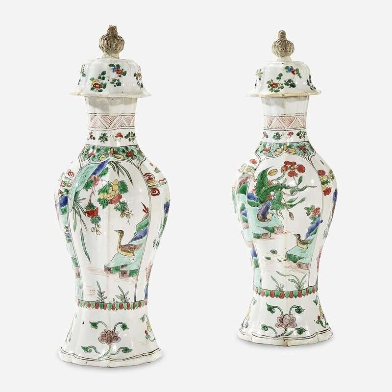 Each body of baluster form and quatralobed section, decorated with panels enclosing birds and landscapes, the covers also lobed and with flared edges, topped with unusual biscuit knops in the form of woven baskets. (2).