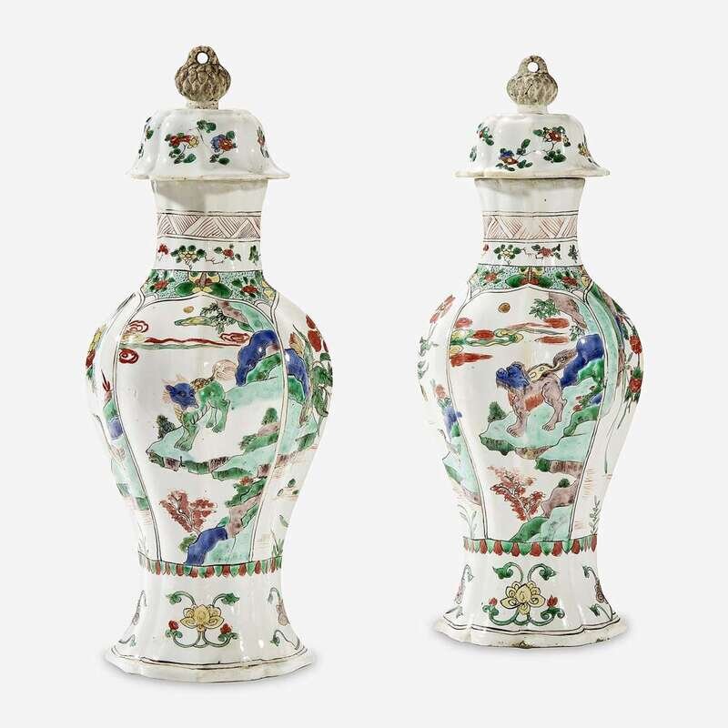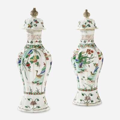 A Pair of Chinese Famille Verte-Decorated Porcelain Baluster Vases and Covers Kangxi period