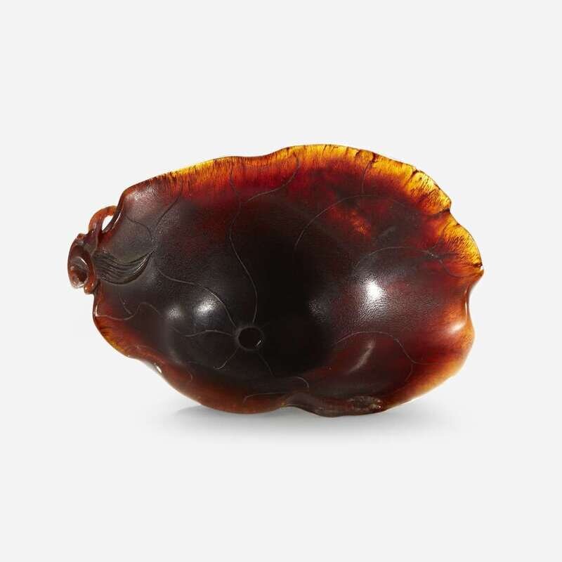 In the form of a cup-shaped lotus leaf, with a sinuous qilong at the 'handle' end, a stalk of millet and another lotus leaf under the 'spout' end, polished glossy surface.