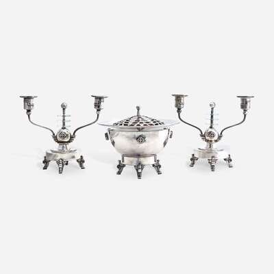 George Albert Feinauer (American, b. Germany, 1886-1955) "Special Line" Centerpiece Potpourri Bowl and Pair of Candelabra, Barbour Silver Company, Hartford, CT, circa 1930