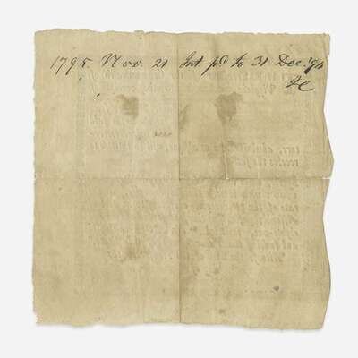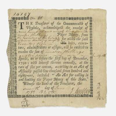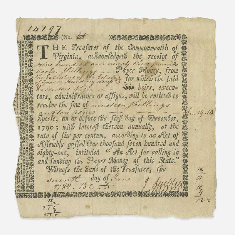 Virginia, June 7, 1782. Partially-printed Commonwealth of Virginia Loan Office certificate issued under an act for "calling in and funding the Paper Money of this State", issued to the estate of Groves Harding, acknowledging "the receipt of nine hundred and ninety three pounds twelve shillings Paper Money...for which the said...heirs, executors, administrators or assigns, will be entitled to receive the sum of nineteen shillings and ten pence Specie..." Ornately engraved borsers; numerical annotations in margins; docketing to verso; recto and verso lightly soiled; creasing from old folds. Anderson V-7. Lot includes a small cut engraving.