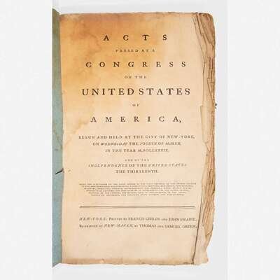 Folio printings of the 1789 first acts of the first Congress, published in any city, are extremely rare. We can locate only seven copies of this edition, in the following institutions: The American Antiquarian Society; The New York Public Library; Yale University, Sterling Memorial; Faulkner University; Indiana University; Connecticut Historical Society; Henry E. Huntington Library and Art Gallery.