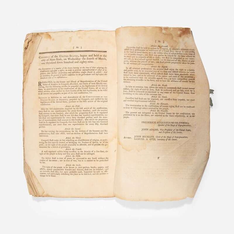 Rare New Haven folio edition of the official acts of the first United States congress. This important volume comprises the acts establishing the Executive Department, the Treasury Department, the Post Office, the judicial courts, the War Department, and other articles establishing compensation for the President, Vice President, and members of Congress. It also contains the first 12 proposed amendments to the Constitution, drafted by James Madison. Articles 3-12 would be ratified on December 15, 1791, forming the first ten Amendments known as the Bill of Rights. Article 2 would be ratified as the 27th Amendment in 1992, while Article 1 is still pending ratification.
