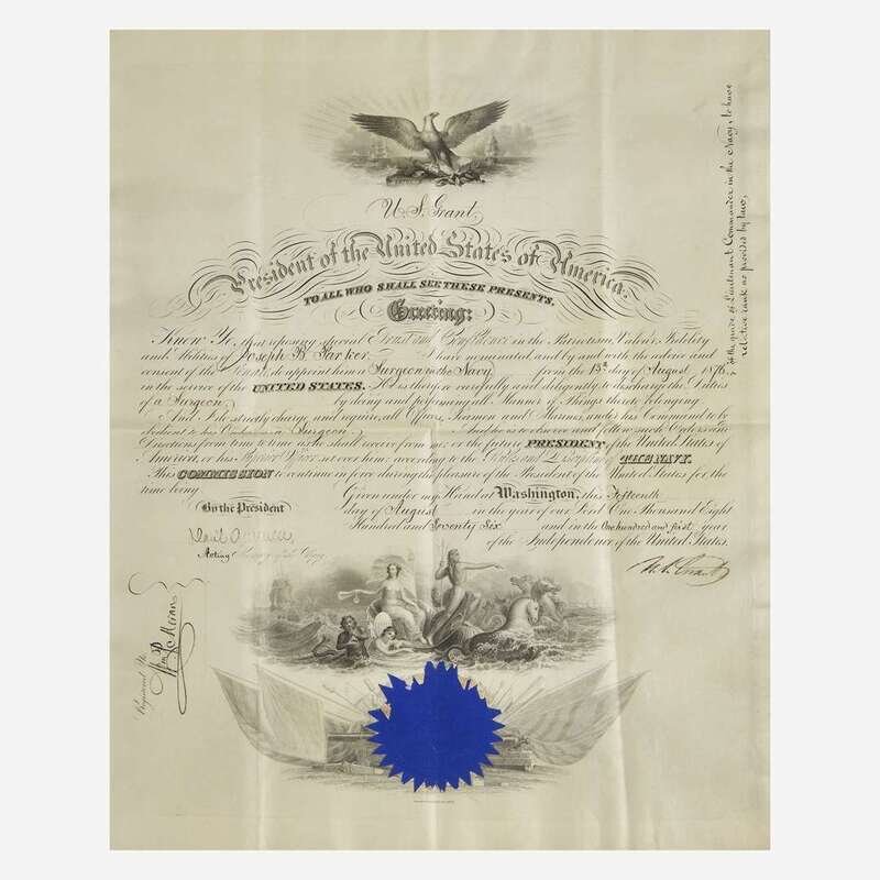 Washington, D.C., August 15, 1876. Partially-printed military commission on vellum, signed by Ulysses S. Grant, as president, appointing Joseph B. Parker Surgeon in the Navy; counter-signed by Acting Secretary of the Navy, Daniel Ammen; embossed blue United States Navy Department seal at bottom, upper points creased. Line "of the grade of Lieutenant Commander in the Navy, to have relative rank as provided by law," added along right side in a secretarial hand. Creasing from original folds. 19 3/8 x 15 3/8 in. (492 x 390 mm).