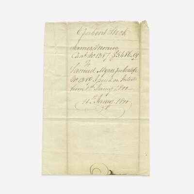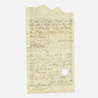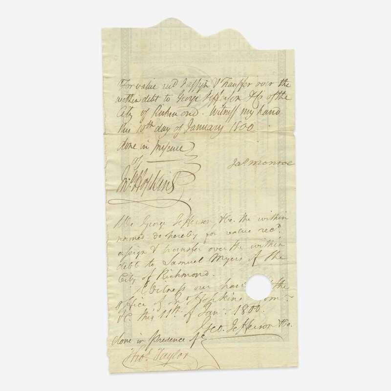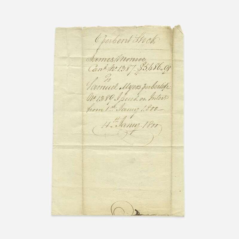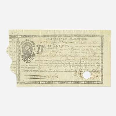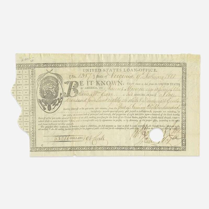Virginia, January 9, 1800. Partially-printed United States Loan-Office certificate, issued to James Monroe, as Governor of Virginia, for $5,486.98, and endorsed by him on verso ("Jas. Monroe"); counter-signed on recto and verso by John Hopkins, Loan Officer for Virginia; additional slip of MS. transferring the stock. Lot includes four printed pieces of ephemera relating to Monroe. Approximately 5 3 /4 x 17 1/2 in. (146 x 444 mm).
