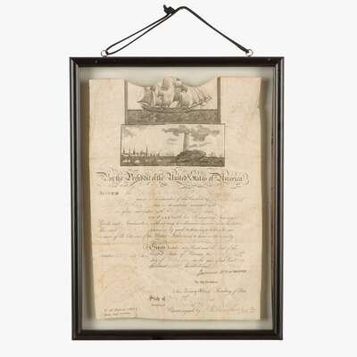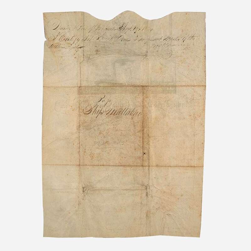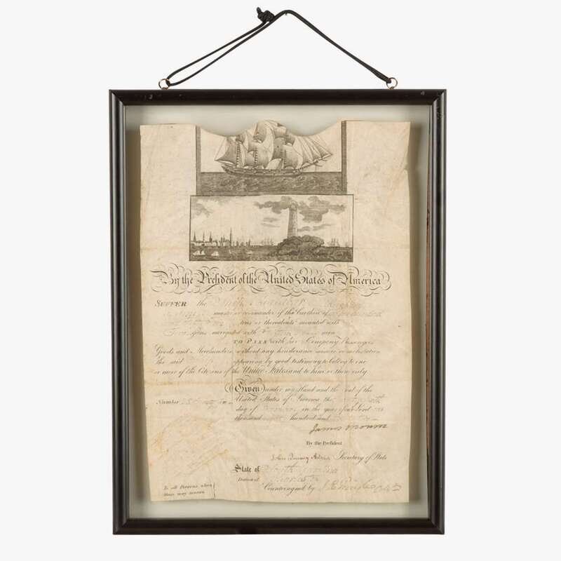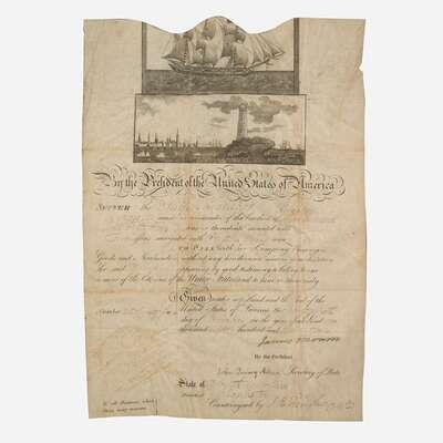 (Washington, D.C.), November, 26 1822. 14 1/2 x 10 1/4 in (368 x 260 mm) (sight). Attractive partially-printed scalloped ship's passport on vellum (Number 25), signed by President James Monroe ("James Monroe") and Secretary of State John Quincy Adams ("John Quincy Adams"), for the Ship Malabar, commanded by Richard Orne; counter-signed by Collector of the Port of Charleston, South Carolina, and future mayor thereof, James R. Pringle ("J.R. Pringle Coll."); paper seal, bottom left, perished. Creasing from original folds; MS. note on verso by an unknown New York port officer, dated August 19, 1824, certifying Josiah Orne as ship's commander. Unexamined out of double-pane glass frame, 16 7/8 x 12 5/8 in. (429 x 321 mm).