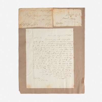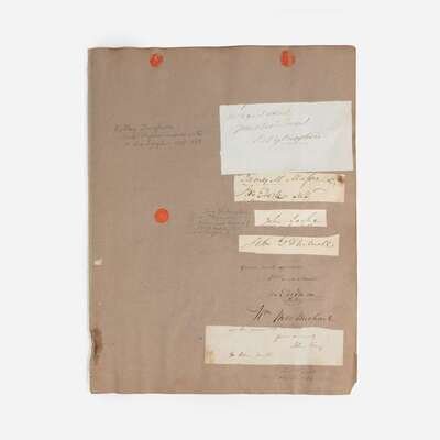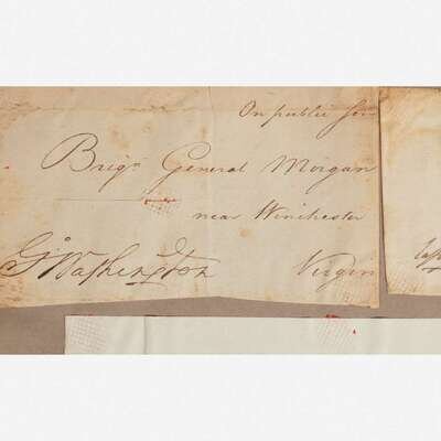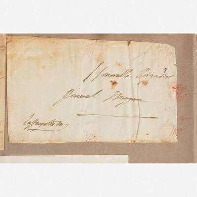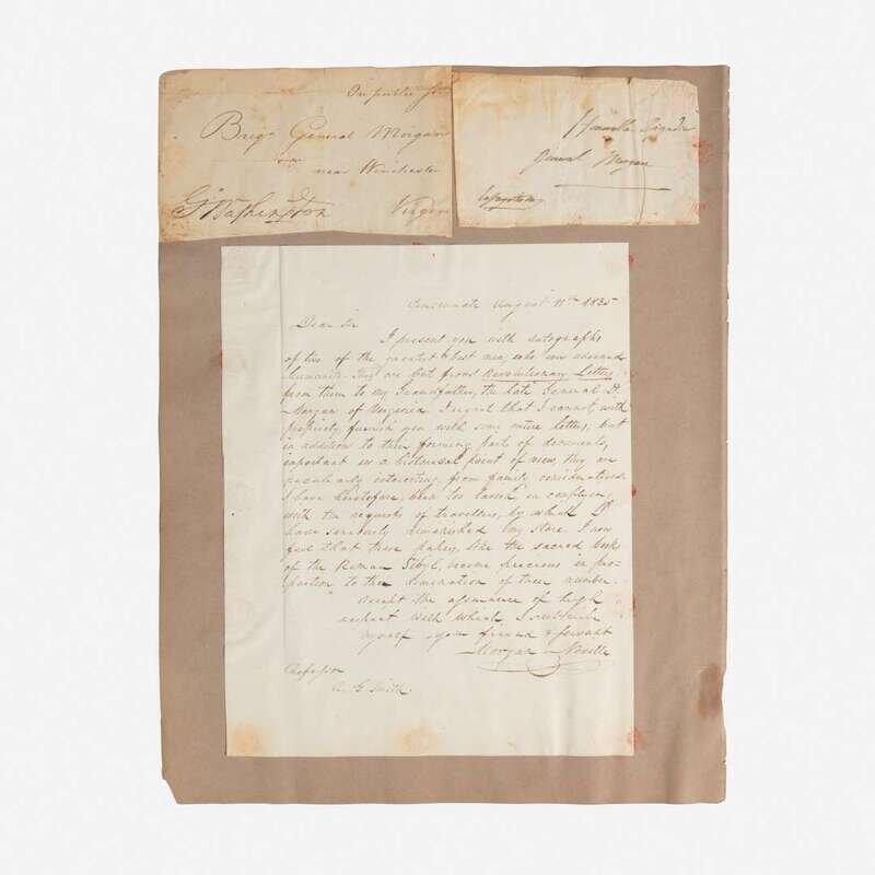 No place, no date. Group of two cut signatures, George Washington and Marquis de Lafayette, mounted to one sheet. Each signature excised from an autograph letter to Brigadier General Daniel Morgan (1735-1802). Includes an autograph letter, dated August 11, 1835, from a Morgan Neville, concerning the two signatures, "I present you with two autographs of two of the greatest & best men, who ever adorned humanity. They are cut from Revolutionary Letters from them to my Grandfather, the late General D. Morgan of Virginia"; mounted to same sheet, 14 1/4 x 11 in. (362 x 279 mm).