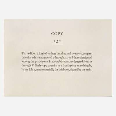 San Francisco: The Arion Press, 1985. First and limited edition, #230/326 numbered copies. 4to. Illustrated with signed frontispiece etching by Jasper Johns, printed by John Lund and Craig Zammiello. Original printed prospectus laid in. Original quarter blue morocco over light blue cloth, stamped in silver; top edge trimmed, other edges untrimmed. Near-fine.