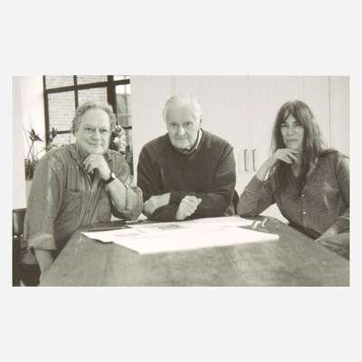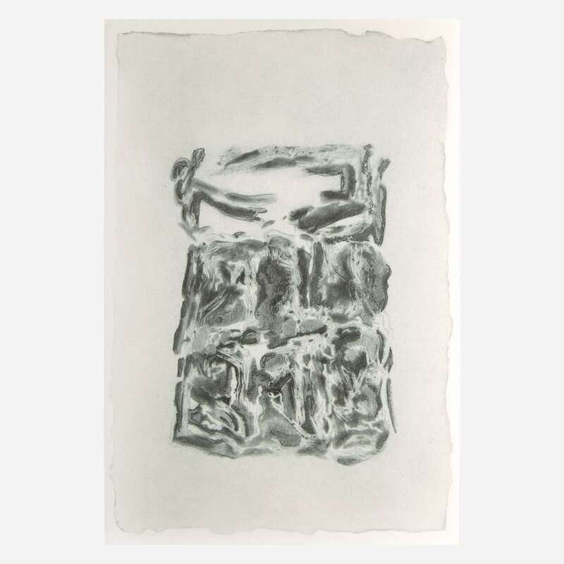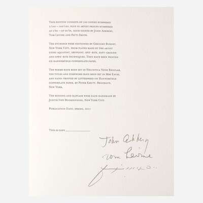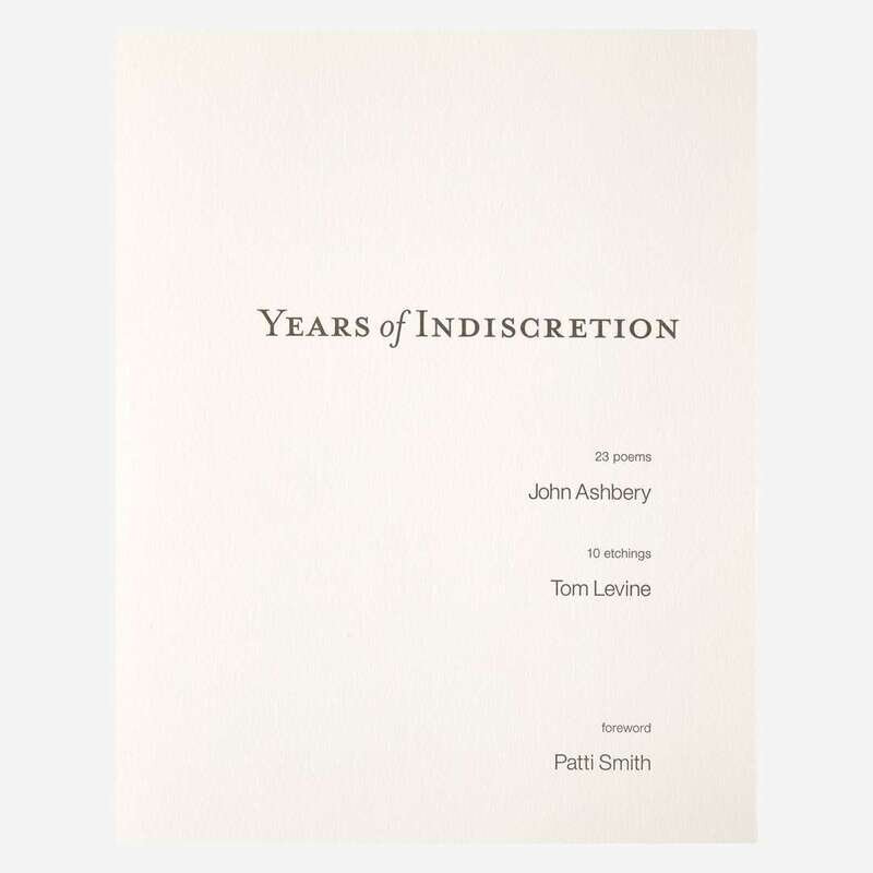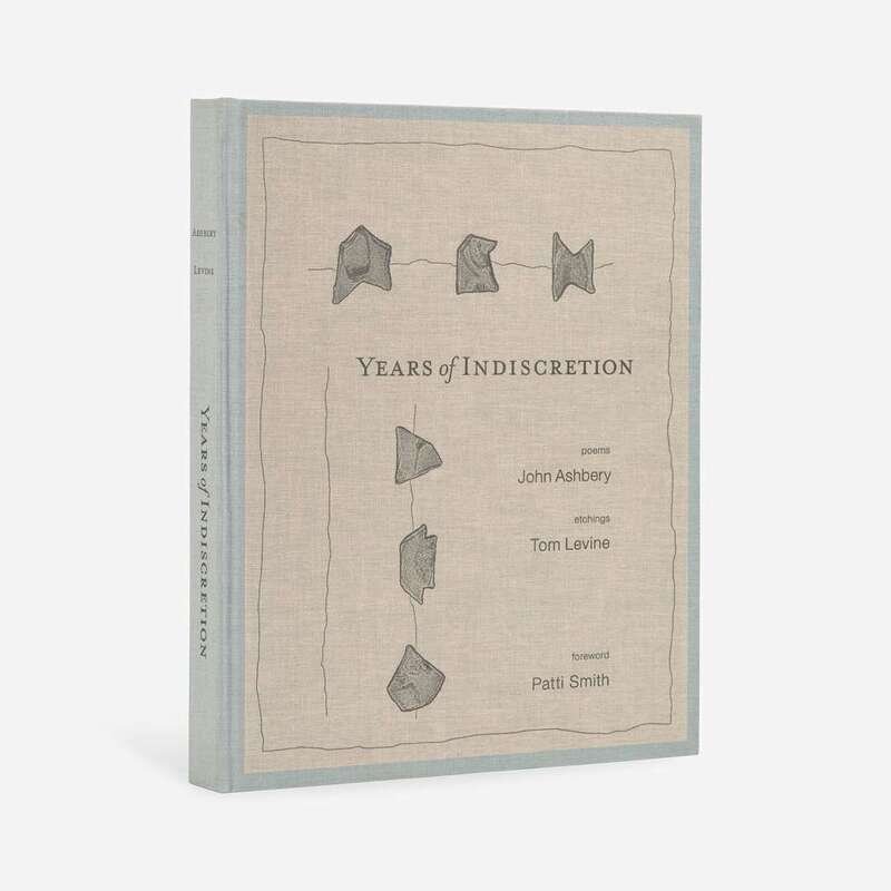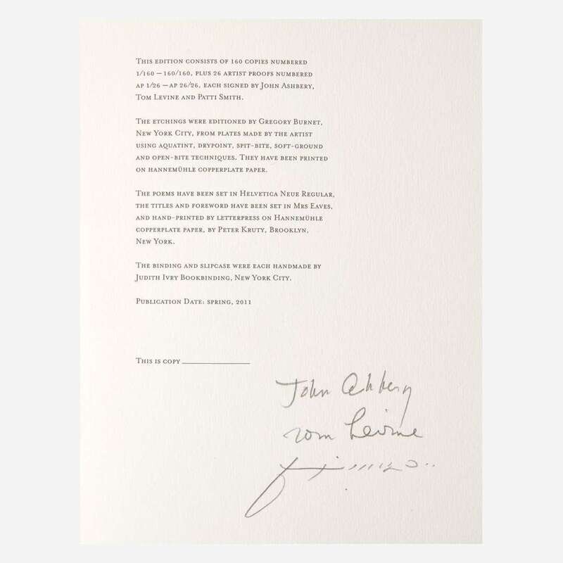 No place, (2011). First and limited edition, out of series copy (from a total edition of 186 printed copies), signed by John Ashbery, Tom Levine, and Patti Smith. 4to. Foreward by Patti Smith. Illustrated with 10 etchings by Tom Levine, printed by Gregory Burnet on Hannemühle copperplate paper. Original full blue and grey linen, stamped in black; all edges untrimmed; handmade pink endpapers; lacking slip case.