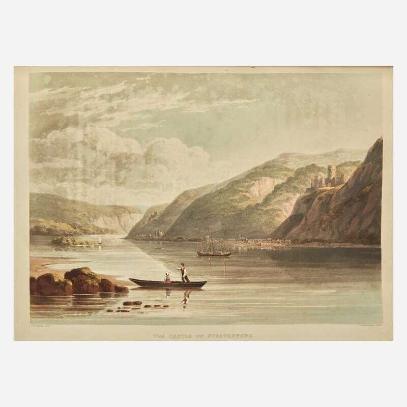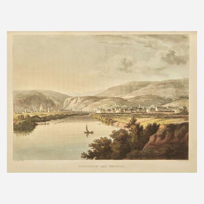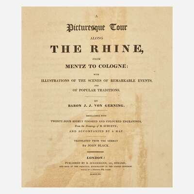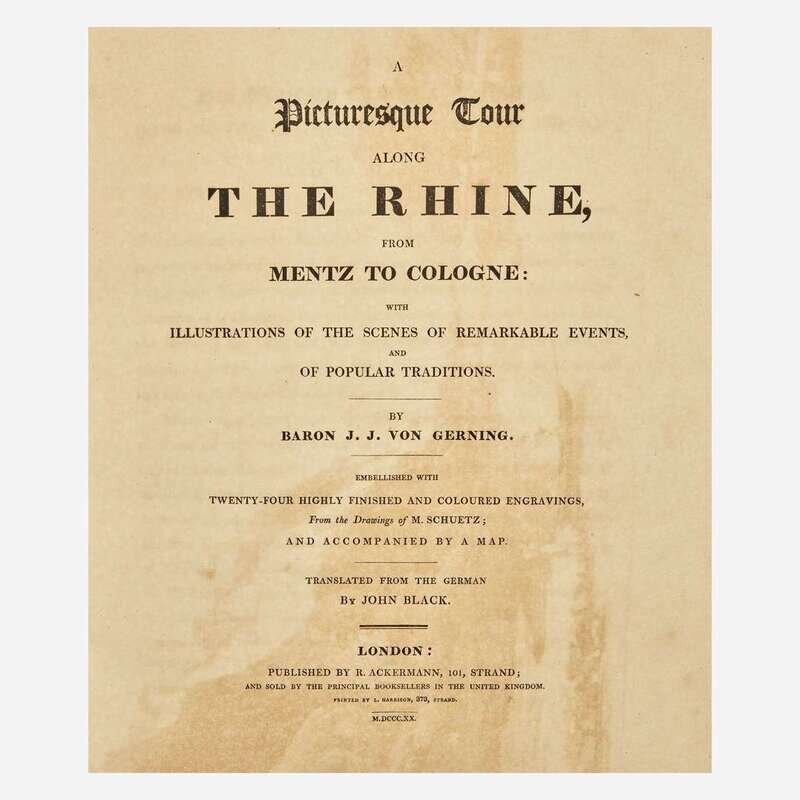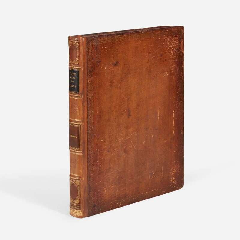 London: R. Ackermann, 1820. First edition. 4to. xiv, (ii), 178 pp. Translated from the German by John Black. Illustrated with 23 (of 24) unnumbered hand-colored aquatint plates by D. Havell and T. Sutherland after C.G. Schuetz (plate 16 [as per Tooley] "Bornhofen" bound in as frontispiece; lacking plate 12, "Braubach" facing p. 105); with tissue guards; plates watermarked J. Whatman, dated 1818; plate two dated September 1819, plate three dated October 1819. Text watermarked 1817-19. Lacking folding map at rear. Contemporary full diced russia, stamped in blind and in gilt, rebacked, brown and black morocco spine labels, boards rubbed and blistered; all edges trimmed; marbled endpapers; offsetting onto title-page; scattered soiling in margins of text; minor offsetting from plates; scattered dampstaining along fore-edge; small repair at bottom pp. 73/74. Abbey Travel 217; Tooley 234