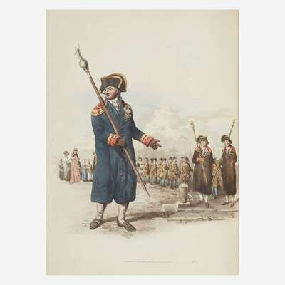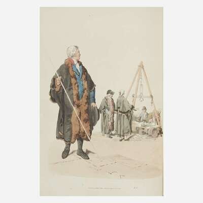 According to Abbey and Tooley, Costume of Great Britain was issued in three states, with Abbey stating: "There are three editions or issues of this book: first with title dated 1804, but on paper watermarked prior to that year. Second, with a title dated 1808; and thirdly, in the above state, with an 1804 title, but recognizable by the later watermark. The edition of 1808 usually has plain backgrounds; both impressions of the 1804 are more desirable in having colored backgrounds." Tooley further states that three types of colored backgrounds exist to correspond to the three states: uncolored, partially colored, and colored. This edition appears to be a mixed issue, with an 1808 title-page, fully colored backgrounds--or at least partially colored, if following Tooley--and some plates with watermarks of 1802 and 1804, as well as a later watermark of 1817. A handsome copy.