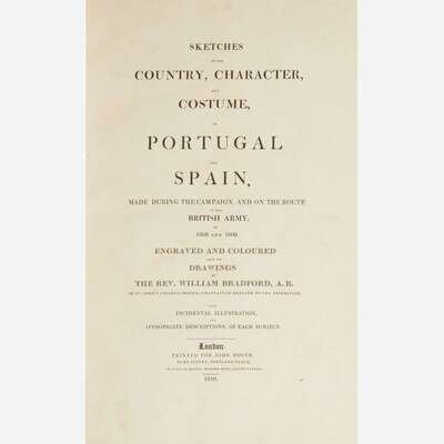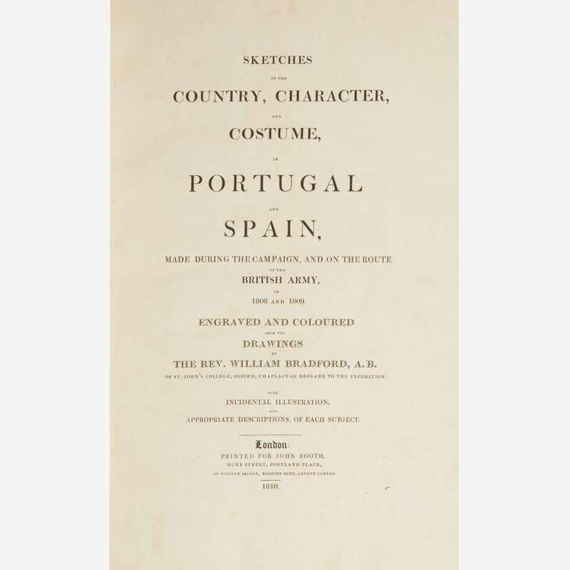 London: Printed for John Booth by William Savage, 1810. First edition. Large folio. 38 pp. Illustrated with engraved frontispiece ("The Monument...To the Memory of Sir John Moore...") and 40 hand-colored aquatint plates, by J. Clark after Bradford; with tissue-guards (foxing and offsetting). Three-quarter brown morocco, stamped in blind and in gilt, over marbled paper-covered boards, extremities and spine rubbed; moderate foxing to frontispiece; scattered, mostly light, foxing to plates; scattered smudging in margins of plates and text; edges toned. Abbey, Travel, Volume One, 135 2B; Tooley 107.