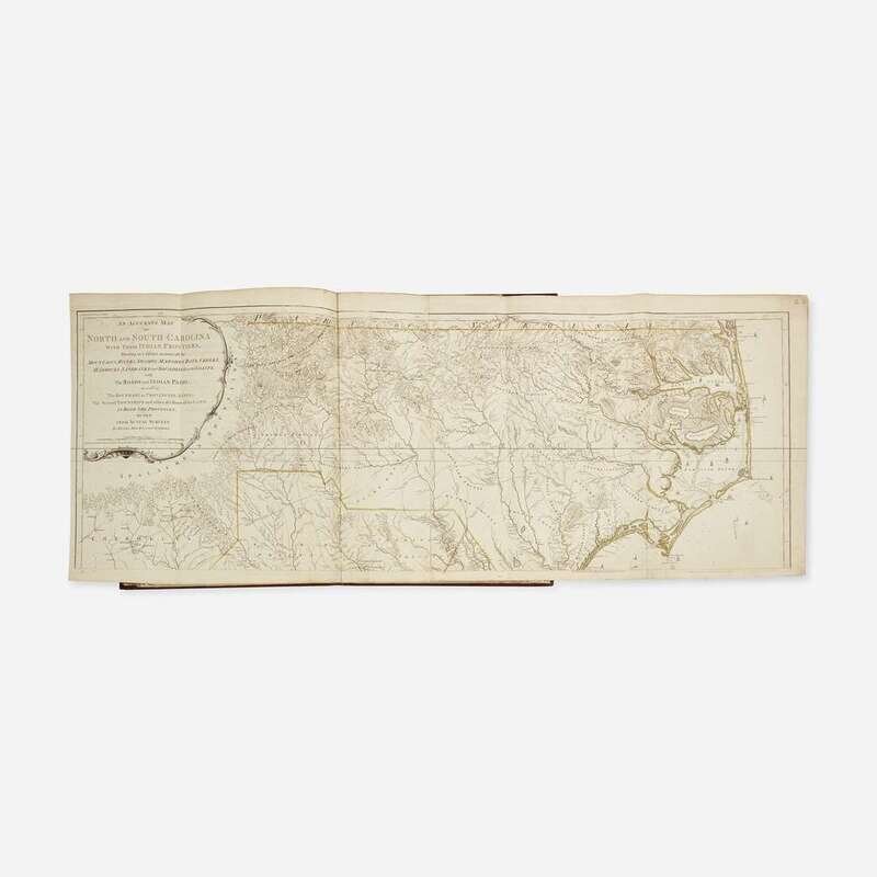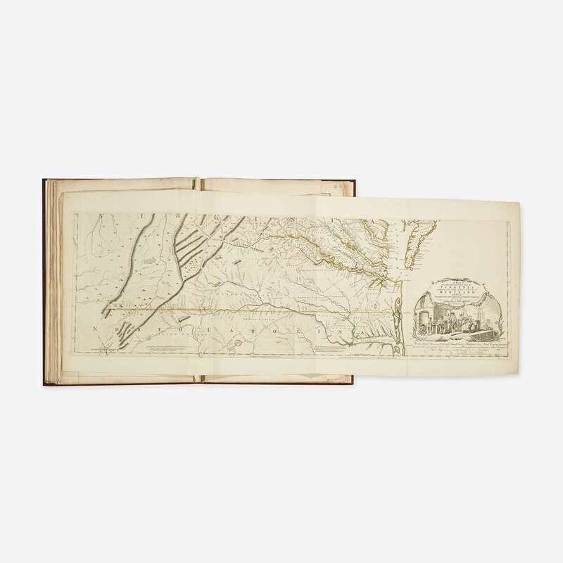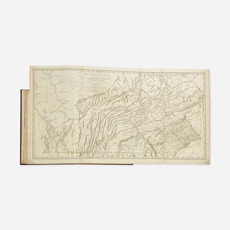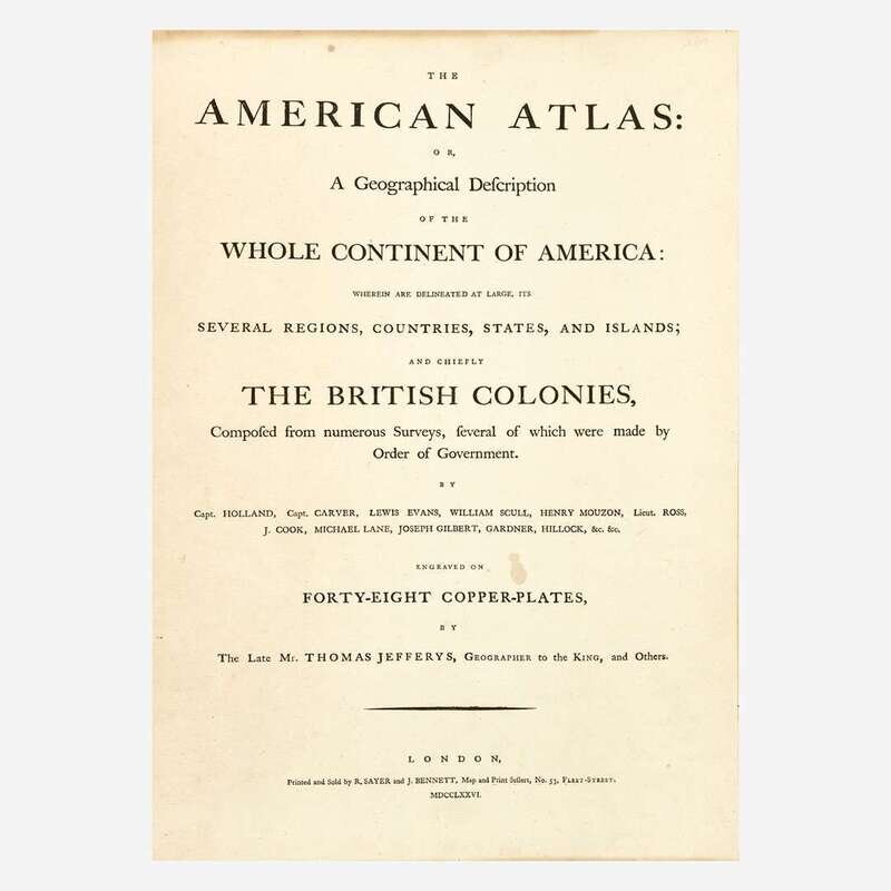 London: Printed and Sold by R. Sayer and J. Bennett, 1776. Second edition, early issue. Folio, 22 1/4 x 16 in. (565 x 406 mm). Letterpress title-page and Index to the Maps. Illustrated with 22 fine engraved maps on 29 sheets, each with contemporary outline hand-coloring, one partly hand-colored (all, but one, double-page or large folding sheets), by Henry Mouzon, Joshua Fry and Peter Jefferson, William Scull, Thomas Jefferys, Samuel Holland, and others; each map numbered in ink in top corner recto. Rebound in full brown diced russia, stamped in gilt, red morocco spine label; all edges trimmed; plates mounted on guards; scattered offsetting and spotting to plates and text. Howes J-81; Sabin 35953.