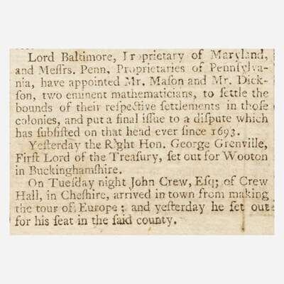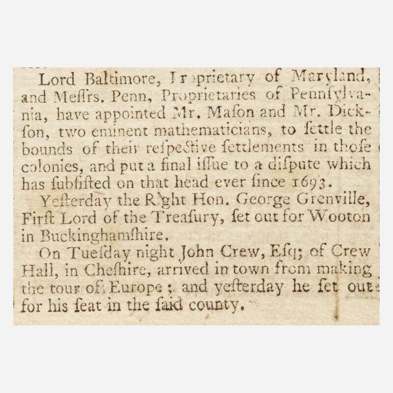 The English newspaper is one of the earliest--perhaps the first--with reference in print to the famous line demarcating Maryland, Pennsylvania, and surrounding states. Printed on the fifth page, the arrival of English mathematicians Charles Mason and Jeremiah Dixon is announced to begin their celebrated survey. Conducted between 1763 and 1767, their survey was commissioned by the Penn family of Pennsylvania, and Calvert family of Maryland, to help settle a land dispute between the two colonies that had persisted for over 80 years. At the time, the survey was a groundbreaking technical achievement, and it settled the dispute peacefully. 50 years later with the Missouri Compromise of 1820, the Mason-Dixon Line would come to separate the slave-holding South from the free North. The line has since come to culturally signify the border between the Northern and Southern United States.