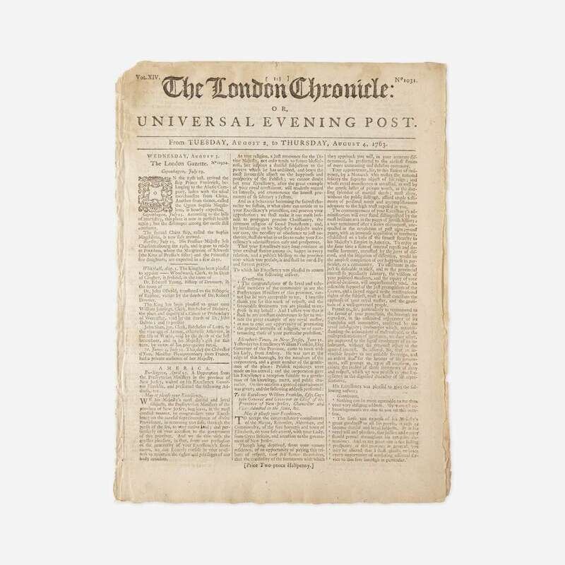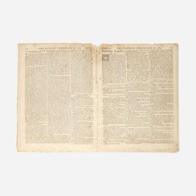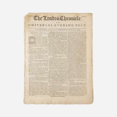 London: J. Wilkie, August 2-4, 1763. Vol. XIV, No. 1031. Folio, 11 1/2 x 8 1/2 in. (292 x 216 mm). Limp printed self-wrappers; spine worn; starting; light dampstaining along top edge. A bright, well preserved example.