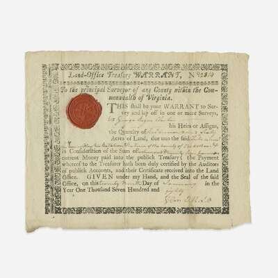 Virginia, January 29, 1780. Partially-printed Commonwealth of Virginia Land-Office Treasury Warrant, made out to Revolutionary War officer and surveyor, George Rogers Clark, for 560 acres of land "for Recruiting his Batalion & in lieu of the bounty of 750 dollars." Printed with engraved border; red wax seal, upper left. Minor soiling at bottom. 6 3/8 x 8 1/8 in. (162 x 206 mm). Lot includes an engraved portrait of Clark.