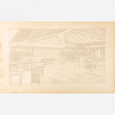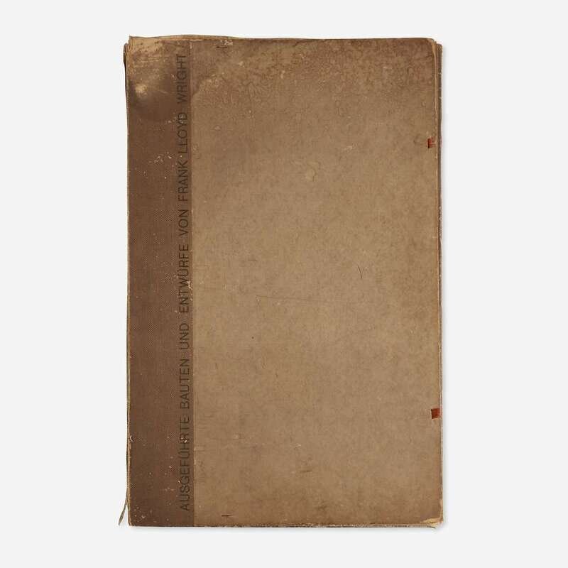Scarce partial first edition copy of Frank Lloyd Wright's highly influential "Wasmuth Portfolio." This portfolio was conceived as a collaboration between Wright and Berlin publisher Ernst Wasmuth to produce a complete portfolio of Wright's work up to that time. Production began in 1909 between Wright and a team of draftsman, including Wright's son, as well as architects Taylor Wooley, and Marion Mahony Griffin, and was published the following year. It proved to be hugely influential to the budding first generation modernist architects in Europe such as Walter Gropius, Ludwig Mies van der Rohe, Theo van Doesburg, and Le Corbusier. Describing the first time he viewed the portfolio, Viennese architect, Richard Neutra--later an assistant to Wright--exclaimed, "Whoever he was, Frank Lloyd Wright, that man far away, had done something momentous and rich in meaning. This miracle man instilled in me the conviction that, no matter what, I would have to go to the places where he walked and worked."