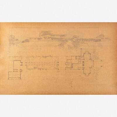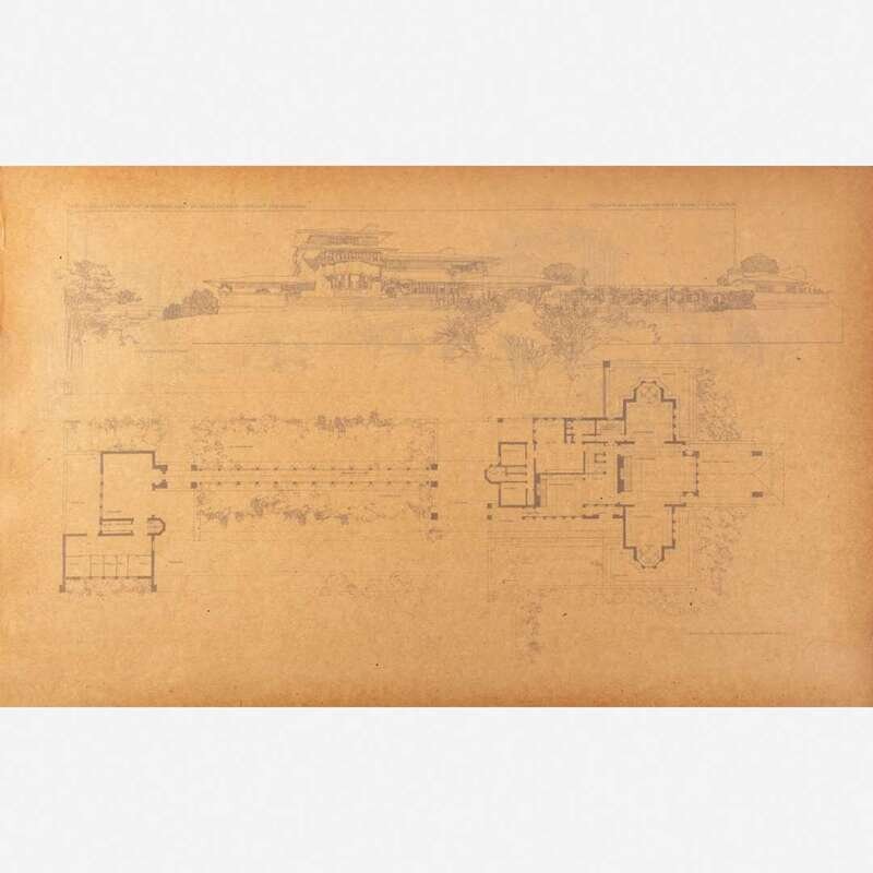 (Berlin: Ernst Wasmuth, 1910). First edition. Partial set, one portfolio only (V.I), containing 34 (of 72) lithographic plates, including plates: I, III-V, VII, IX-XII, VX, XVII-XVIII, XX-XXV, XXX-XXXII, XLIIIa, XLIV, XLVII, XLVIIa, IL (i.e. XLIX), LII, and LVIII-LXIV (plate LVIII tissue overlay only); each with Wright's embossed stamp; plates I, VII, IX, X, XII, XV, XVII, XXX, XXXI, XXXII, XLIX, LII, LVIII (see above note), LX, LXII-LXIV with captioned tissue overlays (plate XV with two overlays); loose as issued. Each measuring 16 x 25 1/4 in. (406 x 641 mm). Lacking text volume. Plates and tissue variously toned; dampstaining along left edge and bottom corner of some plates; scattered wrinkling and chipping to tissue overlays. Original quarter brown cloth over grey-brown board portfolio, stamped in black, worn, dampstained, lacking ties; remnants of removed book-plates and labels on inner panels. Sweeney 87