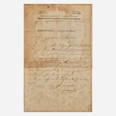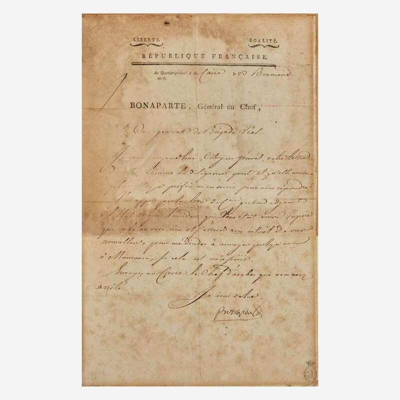 Cairo (Egypt), 23 Brumaire an 7 (November 13, 1798). One sheet, 12 5/8 x 8 1/8 in. (321 x 206 mm). Partially-printed MS. letter on Republique Francaise stationery, signed by Napoleon Bonaparte ("Bonaparte") to Brigadier-General Honoré Vial (1766-1813) during the campaigns in Egypt and Syria: "I have received today, citizen general, your letter from the 18th. Since the coach is leaving, I prefer to use it to answer you since it will arrive faster. I've learned from the letter from General Garbaud at headquaters of the accident that happened to you. I hope it will not be anything and I am awaiting with interest some news from you whether to send someone to Mansour, if it is necessary. Send to Cairo the Arab chief that you have arrested. I salute you, Bonaparte." Creasing from original folds; toning and soiling; armorial ink stamp "Bibliotheca Lindesiana" bottom right corner. Mounted and in frame with two small engraved portraits of Napoleon (20 x 19 3/4 in.; 508 x 502 mm).