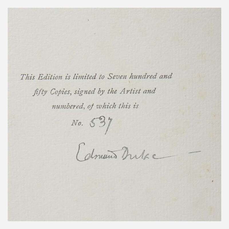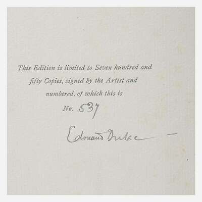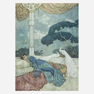 London: Hodder and Stoughton, (1909). First and limited English edition, #537/750 numbered copies, signed by Dulac. 4to. Illustrated with mounted color frontispiece with captioned tissue guard, and 19 mounted color plates, each with captioned tissue guards, by Dulac. Original full white vellum, stamped in gilt, silk ties perished, scattered soiling; all edges untrimmed; patterned endpapers; scattered minor foxing; lacking box; with the book-plate of Hugh W. Dewes on front paste-down. Hughey 21