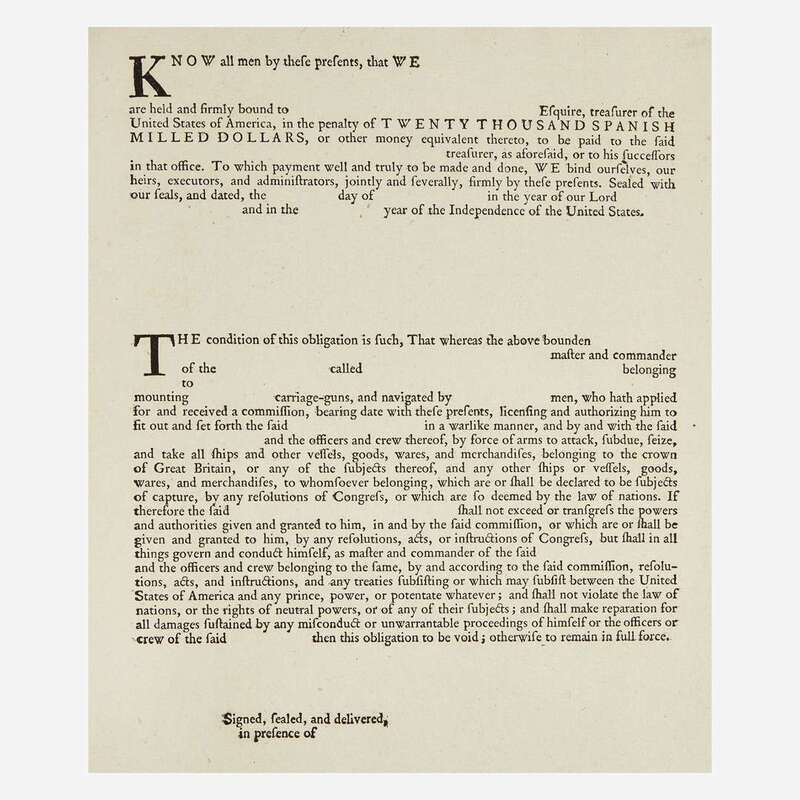 (Passy, France: Benjamin Franklin, 1781). Single sheet; 12 1/4 x 7 7/8 in. (311 x 200 mm). Unsigned printed bond for "Twenty Thousand Spanish Milled Dollars", to be executed by commanders of privateers. Livingston 30. Lot includes an engraved print.
