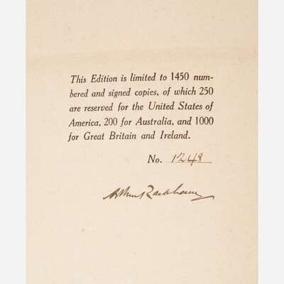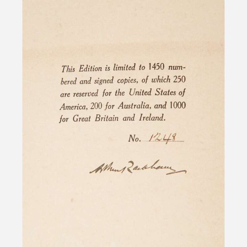 London: William Heineman/New York: Doubleday Page & Co., 1912. First and limited American edition, #1,248/1,450 numbered copies, signed by Rackham. 4to. xxix, (i), 223, (1) pp. Illustrated with mounted color frontispiece with captioned tissue guard, 12 mounted color plates, each with captioned tissue guards, and numerous black and white plates, by Rackham. Original three-quarter brown cloth, over paper-covered boards, stamped in gilt, extremities and spine ends worn, boards toned annd soiled; top edge gilt, other edges untrimmed; ownership signature at head of front free endpaper; scattered minor spotting to text. Riall p. 111; Latimore & Haskell pp. 38-39