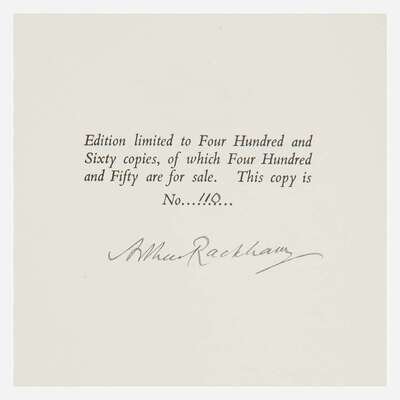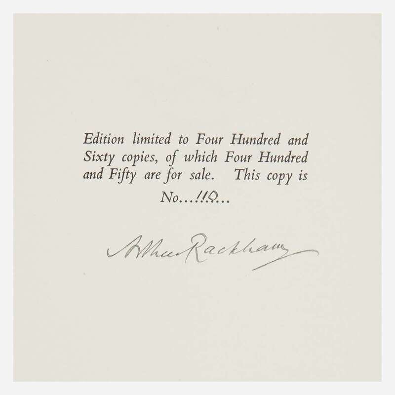 London: George C. Harrap & Co., (1936). First and limited deluxe edition, #110/460 numbered copies, signed by Rackham. 4to. 255, (3) pp. Illustrated with mounted color frontispiece with captioned tissue guard, 11 mounted color plates, each with captioned tissue guards, and numerous black and white in-text illustrations, by Rackham. Original deluxe full vellum, stamped in gilt, spine darkened; top edge gilt, other edges untrimmed; patterned endpapers; ownership signature at head of front free endpaper; in original olive paper slip case, worn. Riall pp. 192; Latimore & Haskell p. 74