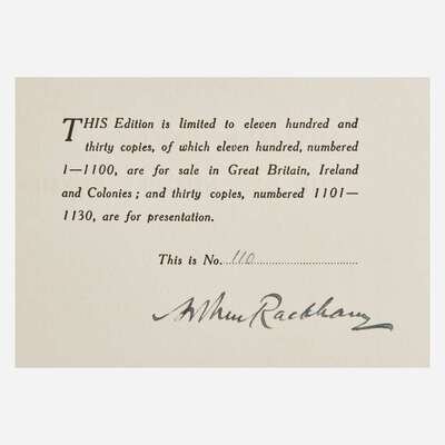 London: William Heinemann, (1913). First and limited deluxe edition, #110/1,100 numbered copies (from a total edition of 1,130 copies), signed by Rackham. 4to. xi, (i), 159, (1) pp. Illustrated with mounted color frontispiece with captioned tissue guard, 12 mounted color plates, each with captioned tissue guards, one mounted black and white plate with captioned tissue guard, and numerous black and white plates, by Rackham. Original full white cloth, stamped in gilt, spine darkened, scattered soiling to boards; top edge gilt, other edges untrimmed; foxing and offsetting to prelims and rear endpapers and index. Riall pp. 115; Latimore & Haskell pp. 40-41