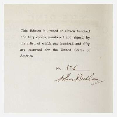 London: William Heinemann/New York: Doubleday Page & Co., 1910. First and limited deluxe edition, #526/1,150 numbered copies, signed by Rackham. 4to. ix, (i), 159, (1) pp. Translated from the German by Margaret Armour. Illustrated with mounted color frontispiece with captioned tissue guard, 33 mounted color plates, each with captioned tissue guards, and numerous black and white in-text illustrations, by Rackham. Original deluxe full vellum, stamped in gilt, original ties intact, scattered minor soiling to boards and spine; top edge gilt, other edges untrimmed; front hinge worn and starting; ownership signature at head of front free endpaper; scattered spotting and darkening to text leaves. Riall p. 103; Latimore & Haskell p. 37