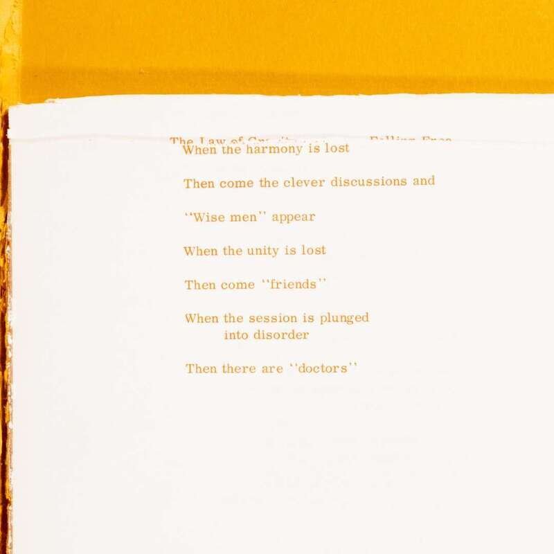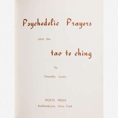 Timothy Leary's own copy of Psychedelic Prayers, cut up by him while experimenting with the cut-up technique, a literary method first employed by the Dadaists, and later developed and made famous by Beat iconoclasts Brion Gysin and William S. Burroughs. In the execution of this aleatory technique, the act of cutting up and rearranging blocks of text was meant to strip the text of its meaning, and Leary believed that this method could textually translate the experience of LSD. The text of Pyschedelic Prayers is based on the Tao Te Ching, an ancient Chinese text attributed to the Taoist philosopher Lao Tzu. According to his foreward, Leary took nine English translations of the Tao Te Ching and translated them “from English to psychedelese.” Each resulting psychedelic poem, writes Leary, was intended to be read during a certain time in the sequence of an LSD session.