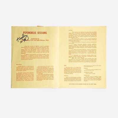 No place, ca. 1965-66. Folio, 11 x 8 1/2 in. (279 x 216 mm). Printed program for Timothy Leary and Ralph Metzner's travelling group sessions, Psychedelic Sessions, for the fall and winter of 1965-66. Signed and dated by Leary in pen on second page, annotations by him in pencil on front and rear wrapper. Original printed limp self-wrappers; creasing from original folds; in gray cloth chemise and slip case.