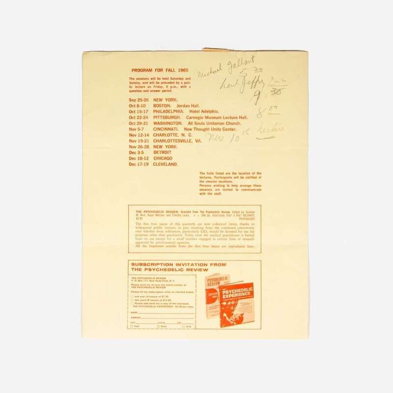 Timothy Leary's signed and annotated copy of his and Ralph Metzner's program for their Psychedelic Sessions, a 12-city tour held in the fall and winter of 1965-66. By 1963 the Federal Government had restricted the use and experimentation of psychedelic drugs to mental health facilities. Leary and Metzger in response, sought to "produce a psychedelic or ecstatic experience without using drugs." They organized 10-hour group sessions with the aim to "reproduce and induce the LSD experience" with the utilization of numerous Eastern and Western psychedelic methods, including meditation, centering, breathing, sensory withdrawl, as well as psychodrama, Gestalt therapy, and multi-media stimulation.