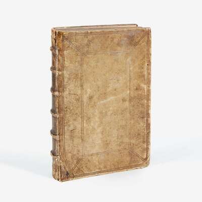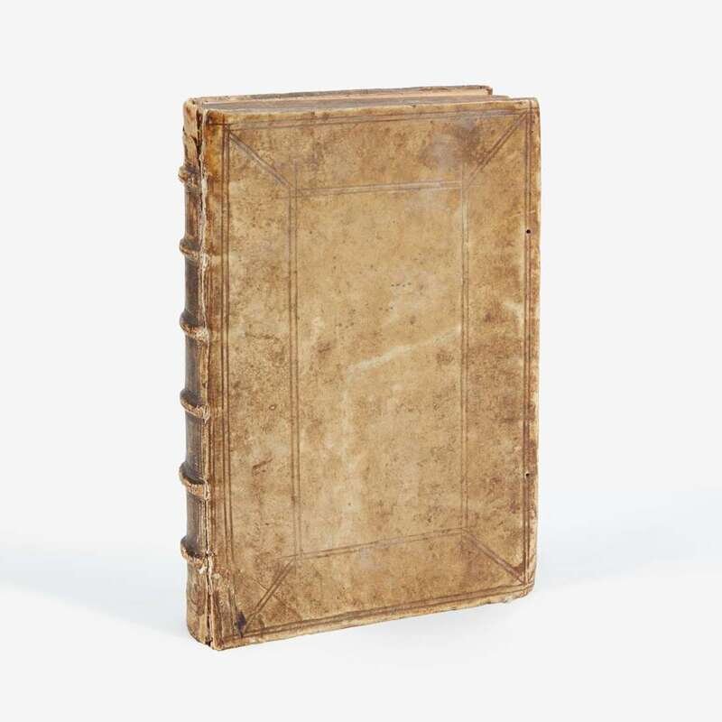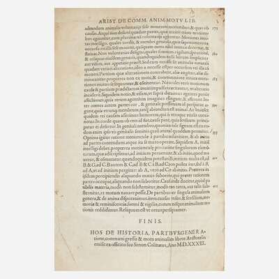 Parisiis: Simonis Colinaei, 1533. Second edition thus (second Simon de Colines edition). Folio, 11 7/8 x 8 1/8 in. (302 x 206 mm). ff. (36), 101, (10), 42, 53, (3), 13. From the library of American classicist and historian of ancient philosophy, Harold Cherniss (1904-87), with his signature on front paste-down, as well as from the library of Czech physicist George Placzek (1905-55), as indicated by an inscription by Cherniss on front free endpaper: "Harold Cherniss/1952 from the library of George Placzek", as well as from the library of Allan Gotthelf on front paste-down. Illustrated with woodcut vignette title-page as well as woodcut initials throughout volume. Contemporary full vellum, stamped in blind, front board starting, boards soiled; all edges trimmed; front free endpaper creased and repaired along gutter, top corner of front free endpaper repaired, old cataloguer's notes on same; title-page somewhat darkened with scattered edge-wear; scattered, mostly minor, worming to text (most prevalent at rear); final text leaf repaired along top edge and at bottom corner; rear free endpaper creased and repaired; worming in rear paste-down.