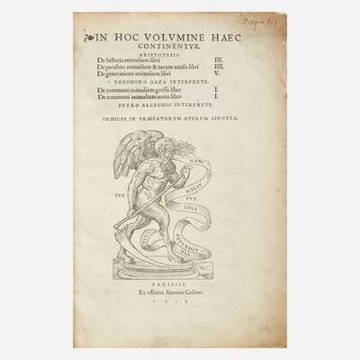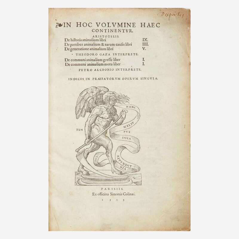 Reprint of the 1524 edition of Aristotle's three main treatises on biology, featuring translations by Greek humanist Theodorus Gaza (1398-1475), as well as Italian humanist Pietro Alcionis (1487-1527).