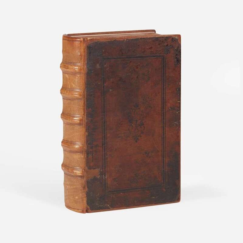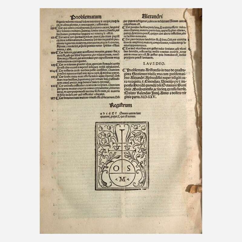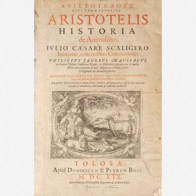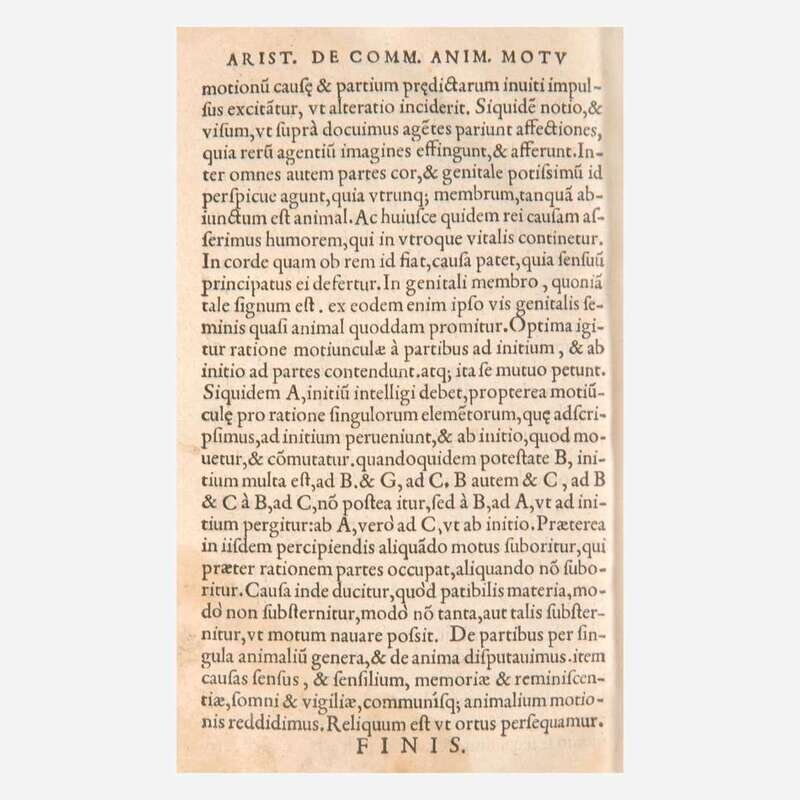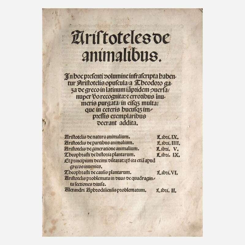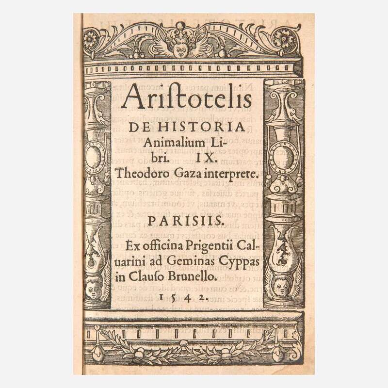 Parisiis: Ex officina Prigentii Caluarini ad Geminas Cyppas in Clauso Brunello, 1542. 8vo. ff. 180, 7, (1 blank). Full brown calf, stamped in black, recased with original front and rear board calf laid down; edges stained red; bottom edge of text lightly dampstained; scattered marginalia. Bound with: De partibus animalium, & earu causis, libri IIII... Same imprint as above. ff. 80. Scattered dampstaining in margins. Bound with: De generatione animalium libri V... Same imprint as above. ff. 94, 2. Dampstaining along bottom edges of text, and at bottom corners. Bound with: Hoc volumine continentur...Petro Alcyonio interprete. Same imprint as above. ff. 23. Dampstaining along bottom edges of text, and at bottom corner.