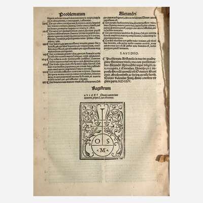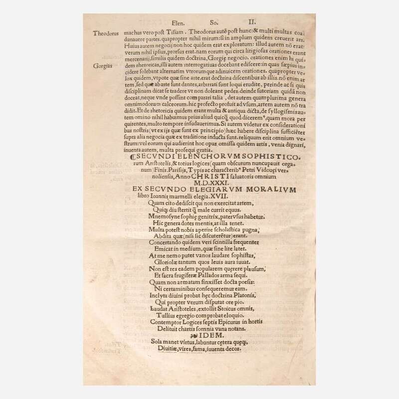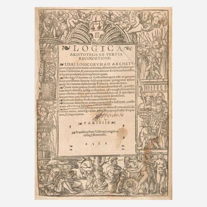 Parisiis: Petri Vidouei, 1531. Folio. ff. 271. Illustrated with a woodcut vignette-border title-page, numerous in-text woodcut diagrams, and woodcut initials. Full contemporary limp vellum, title in ink on spine, three (of four) ties intact; all edges trimmed; dampstaining and soiling to front and rear endpapers; ownership signature of philosopher Allan Gotthelf on front free endpaper; edges of title-page repaired; dampstaining at bottom corner of pp. I-XXXIII, and in gutter of pp. CXXIX-CCXI; extensive early marginalia throughout.