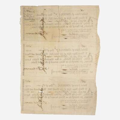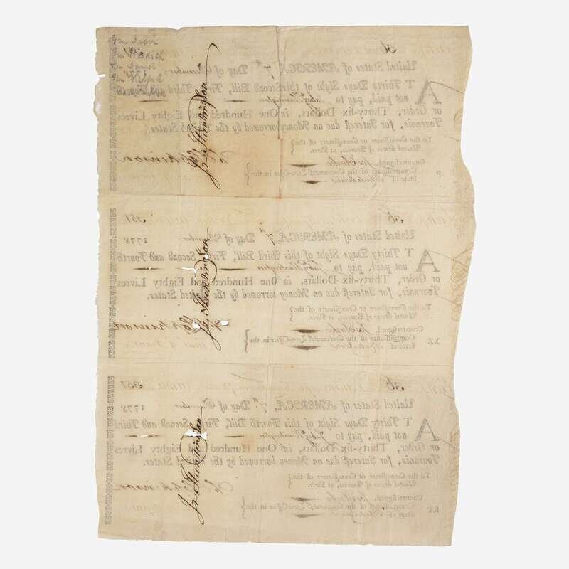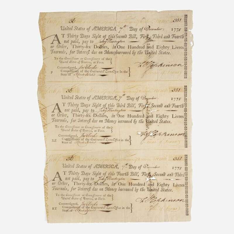 Rhode Island, December 7, 1778. One sheet, 11 1/2 x 8 3/8 (292 x 213 mm). Partially-printed group of three uncut sight drafts, being the second, third, and fourth bills of exhange, issued to Connecticut merchant and Major General of the Connecticut militia, Jabez Huntington (1719-86) for $36, "in One Hundred and Eighty Livres Tournois, for Interest due on Money borrowed by the United States"; each signed by Declaration of Independence signer, Francis Hopkinson, as Treasurer for the Continental Loan-Office; each counter-signed by Joseph Clarke, as Commissioner of the Continental Loan-Office in the State of Rhode Island; each signed by Huntington on verso. Creasing from original folds; small open tears along right side, affecting "H" in Hopkinson's second signature. Anderson 11A