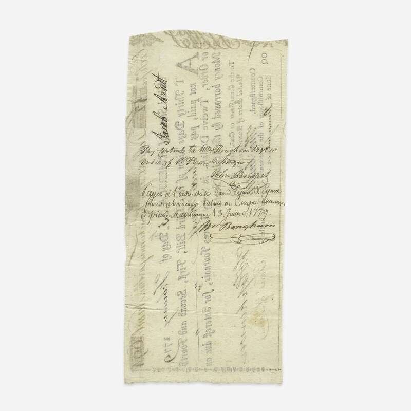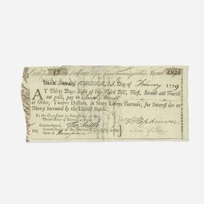 Pennsylvania, February 25, 1779. One sheet, 3 3/4 x 8 1/4 in. (95 x 209 mm). Partially-printed sight draft, being the third of exchange, issued to Jacob Arndt for $12, "in Sixty Livres Tournois, for Interest due on Money borrowed by the United States", signed by Hopkinson, as Treasurer for the Continental Loan-Office; counter-signed by Thomas Smith, as Commissioner of the Continental Loan-Office in Pennsylvania; signed by Arndt on verso; additonally inscribed on verso, transferring payments to William Bingham, signed by John Benezet, and further endorsed by Bingham, in French, dated July 13, 1779. Lightly worn. Includes an engraved portrait of Hopkinson. Anderson 10A