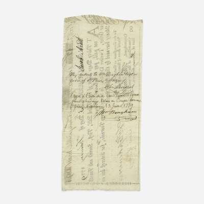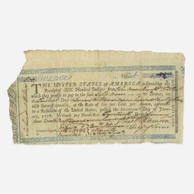 No place, January 14, 1780. One sheet, 5 1/4 x 9 7/8 in. (133 x 251 mm). Partially-printed promissory note, issued to a John Moore, for repayment of $600 "with Interest anually, at the Rate of Six per Cent. per Annum", signed by Hopkinson as Treasurer for the Continental Loan-Office. Creasing from original folds; edges worn. Lot includes a T.L.s from Barclays Bank, dated 1961, regarding collecting on the then 181-year-old note. Anderson US 51.